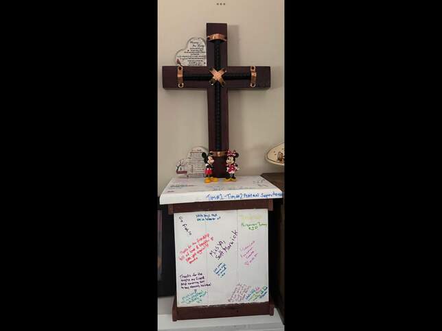 he made the cross, I had the ashes box made and painted it white for the beautiful messages. Mickey and Minnie were out wedding cake toppers